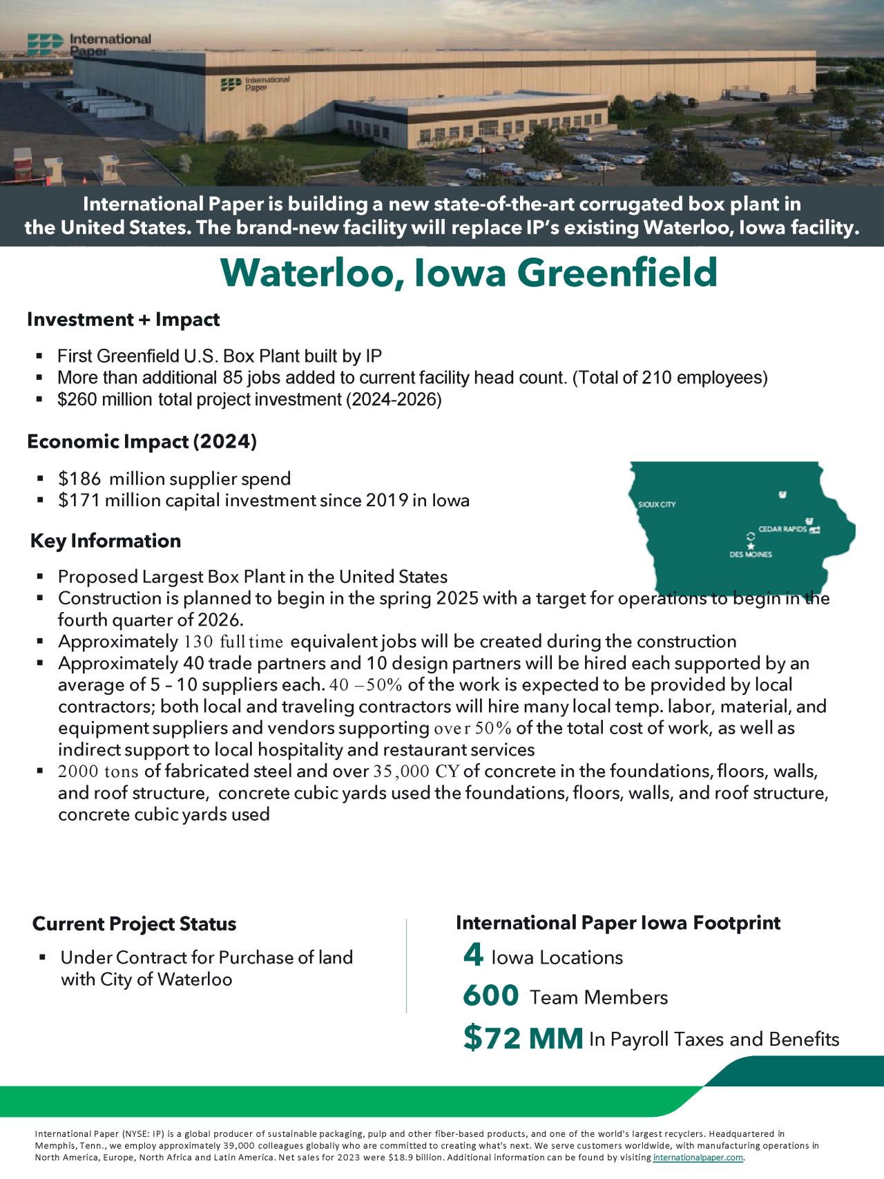 MEMPHIS, Tenn., May 12, 2025 /3BL/ - International Paper (NYSE: IP; LSE: IPC), a global leader in sustainable packaging, is proud to announce the groundbreaking of its new state-of-the-art sustainable, packaging box plant in Waterloo, Iowa.