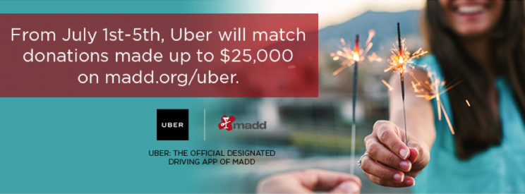So, from July 1st through the 5th, Uber is matching all donations to MADD, $1 for $1, up to $25,000. This is only the start of our expanded partnership.