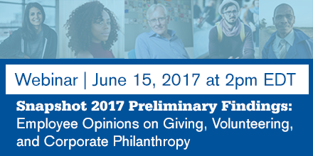 On June 15, 2017 at 2pm EDT, you’re invited to a webinar exploring these six key findings and other preliminary learnings from America’s Charities’ new Snapshot 2017 research on employee donors’ attitudes, perceptions, and motivators regarding workplace giving and employee engagement.Â