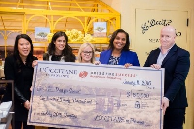 NEW YORK, Jan. 12, 2016 /PRNewswire/ — Natural French beauty retailer L’OCCITANE has donated$120,000 to Dress for Success, a gift that will help up to 2,400 women begin their journey to achieving their professional goals in 2016.  L’OCCITANE U.S. Managing Director Maddie Smith presented the check to Dress for Success Worldwide CEO Joi Gordon during a ceremony in New York City yesterday.