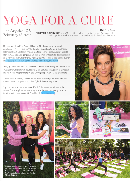 On February 13, 2014, Maggie DiNome, MD, Director of the newly developed High-Risk Clinic at the Cancer Prevention Clinic at the Margie Petersen Breast Center at Providence Saint John’s Health Center in Santa Monica, CA, hosted a gorgeous fundraiser with actress Kate Beckinsale and celebrity yoga instructor Many Ingber, New York Times best-selling author of Yogalosophy: 28-days to the Ultimate Mind-Body Makeover.
